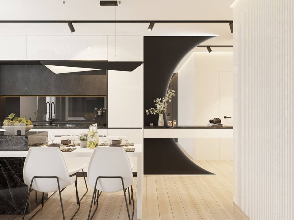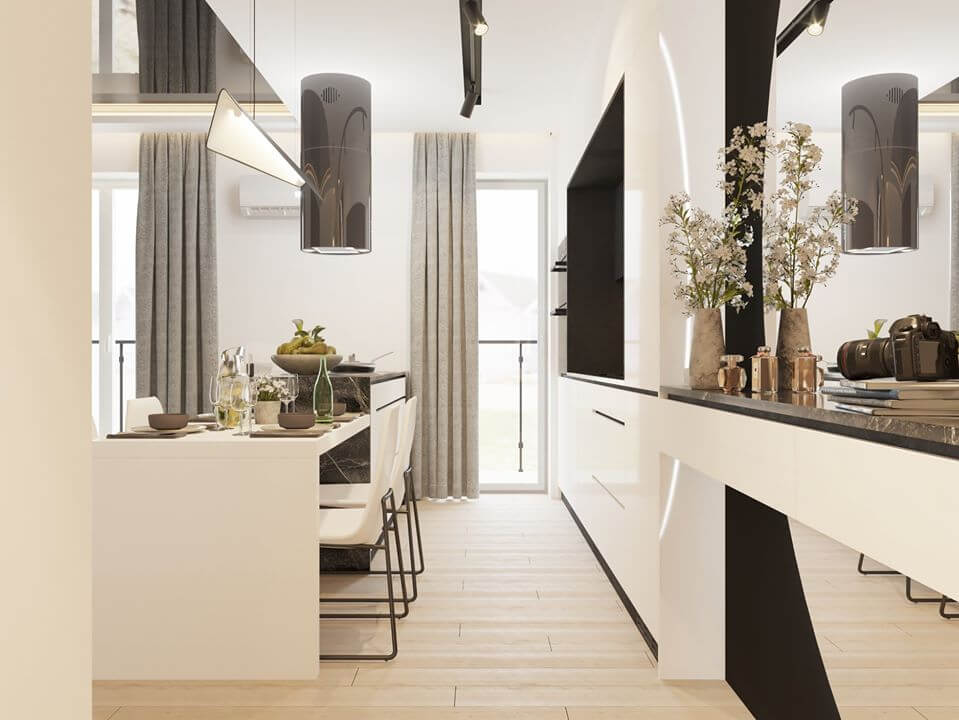 Bucătăria deschisă spre living este luminoasă, spațioasă și modernă. Impresionează prin caracterul său elegant și eleganța nepretențioasă. Blatul de lucru negru și rafturile în aceeași culoare creează un contrapunct ideal pentru dulapurile superioare albe și culoarea pereților. Însă piesa centrală rămâne insula de bucătărie care se conectează cu o masă originală, înconjurată de scaune neobișnuite, tip sanie.