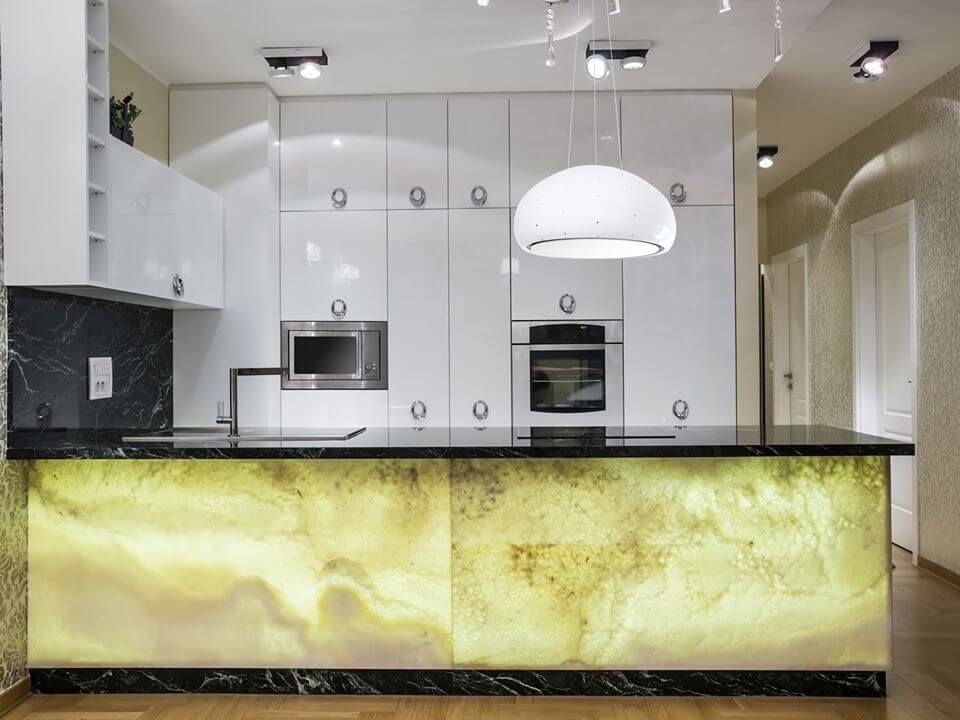 Arhitecții și designerii de interior care creează o locuință inspirată de stilul Art Deco trebuie să abordeze și designul bucătăriei. Cel mai adesea, aceștia optează pentru o combinație contrastantă de alb și negru. Mobila de bucătărie lucioasă va arăta excelent alături de o insulă de bucătărie elegantă, finisată cu marmură. În plus, un perete de protecție (fartuch) sau pervazurile ferestrelor realizate din această piatră nobilă vor conferi întregului un caracter sofisticat.