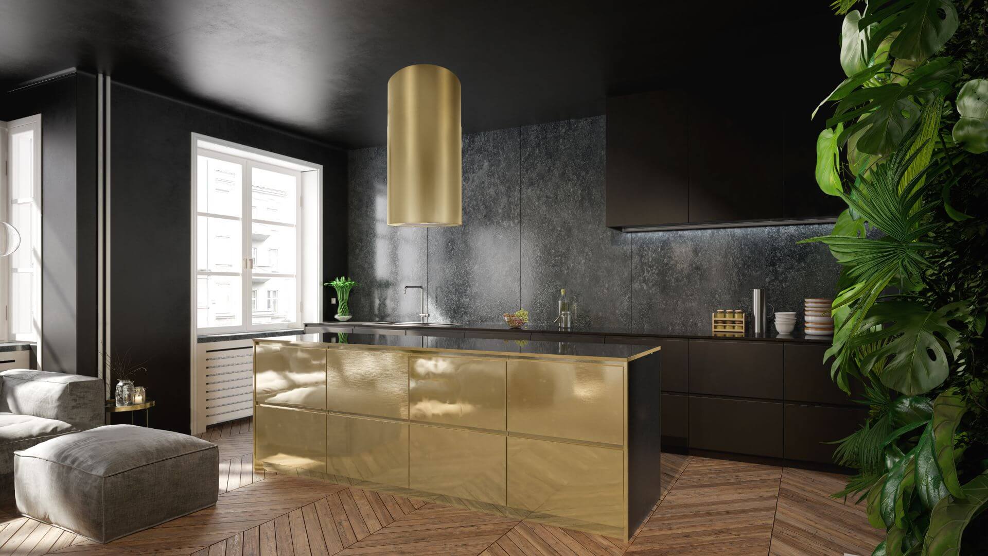 Una dintre cele mai impresionante propuneri este hota Cylindro Auriu de la marca poloneză Nortberg. Forma sa cilindrică minimalistă, subliniată de nuanța nobilă de auriu, arată splendid atât deasupra unei insule de bucătărie de un negru intens, a popularului terrazzo, cât și a clasicului alb de marmură.