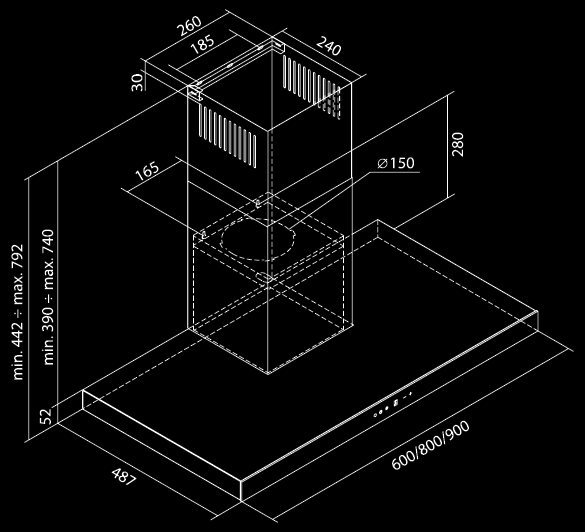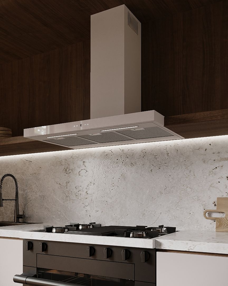Noua variantă a hotei de perete Sento OR este realizată cu atenție la cele mai mici detalii, vopsită integral într-o culoare neagră la modă, adaptându-se astfel la cele mai recente tendințe în bucătărie. O atenție deosebită merită partea frontală, care este acoperită cu sticlă securizată neagră, unde, în centru, se află panoul de control tactil cu afișaj. Pe partea inferioară sunt două benzi LED care vor ilumina perfect suprafața blatului. Hota este disponibilă în trei dimensiuni: 60 cm, 80 cm și 90 cm.