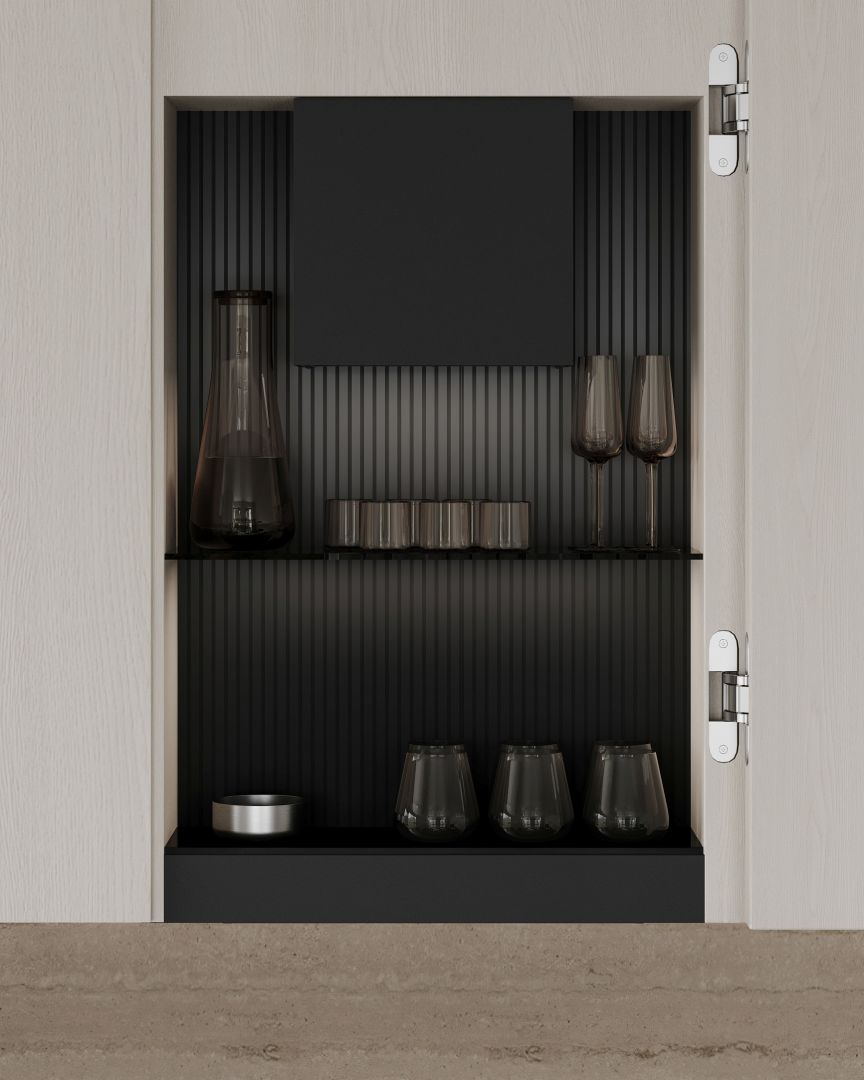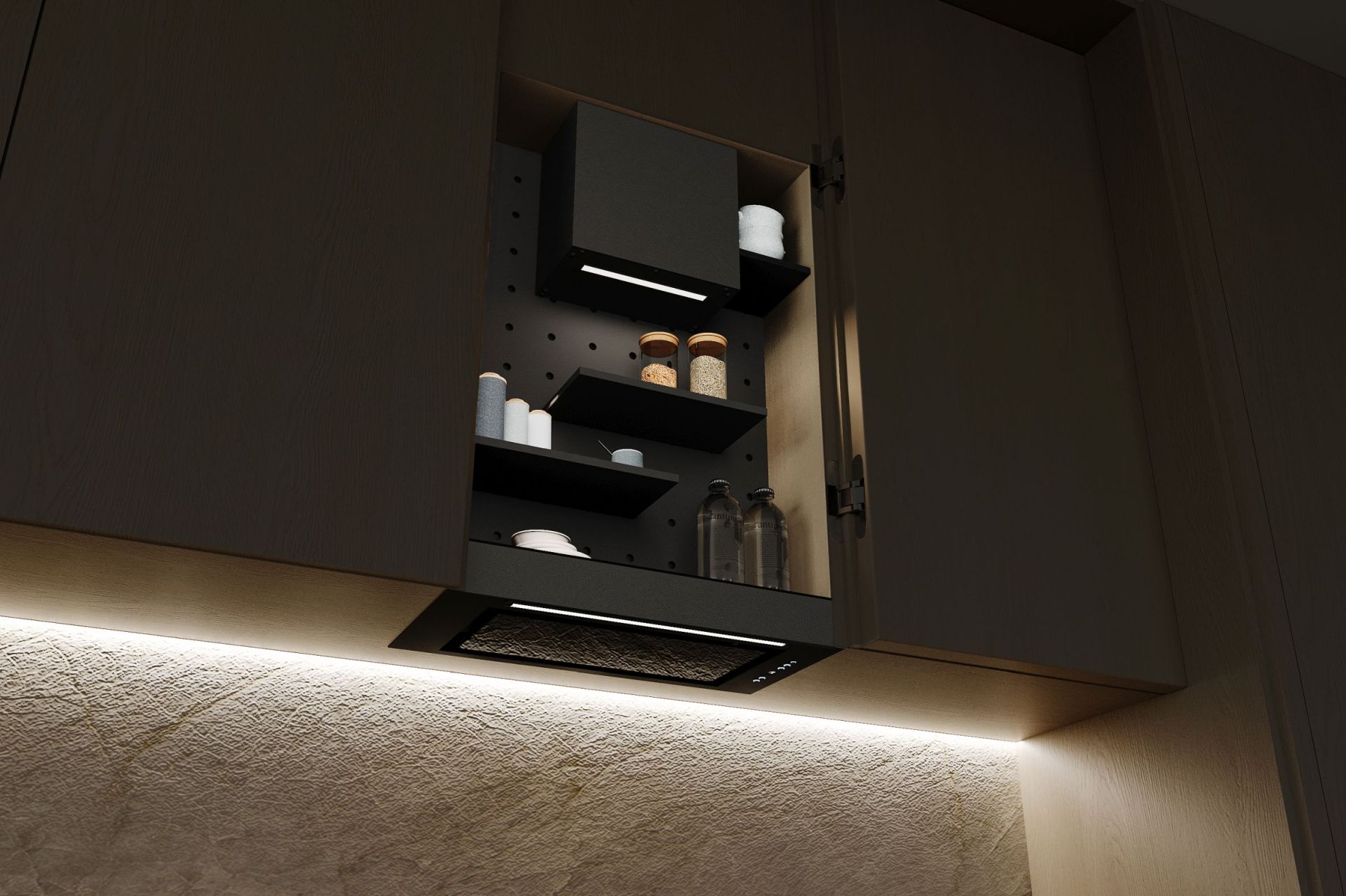 O hotă de încorporat într-o nouă prezentare! Proiectată pentru cei care prețuiesc organizarea funcțională a spațiului din bucătărie. Ascunsă în dulap, ca o hotă clasică încorporabilă sub dulap, în loc de o turbină atașată la corp, a fost echipată cu un conductă de ventilație plată acoperită ingenios de o mască. Datorită acestei soluții, tâmplarii au posibilitatea de a personaliza interiorul dulapului exact așa cum dorește Clientul.