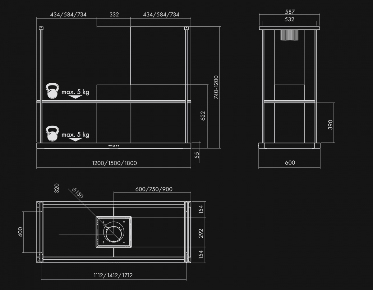 - Potrivire excelentă cu suprafața insulei de bucătărie – hotă disponibilă în dimensiuni: 120 cm, 150 cm, 180 cm