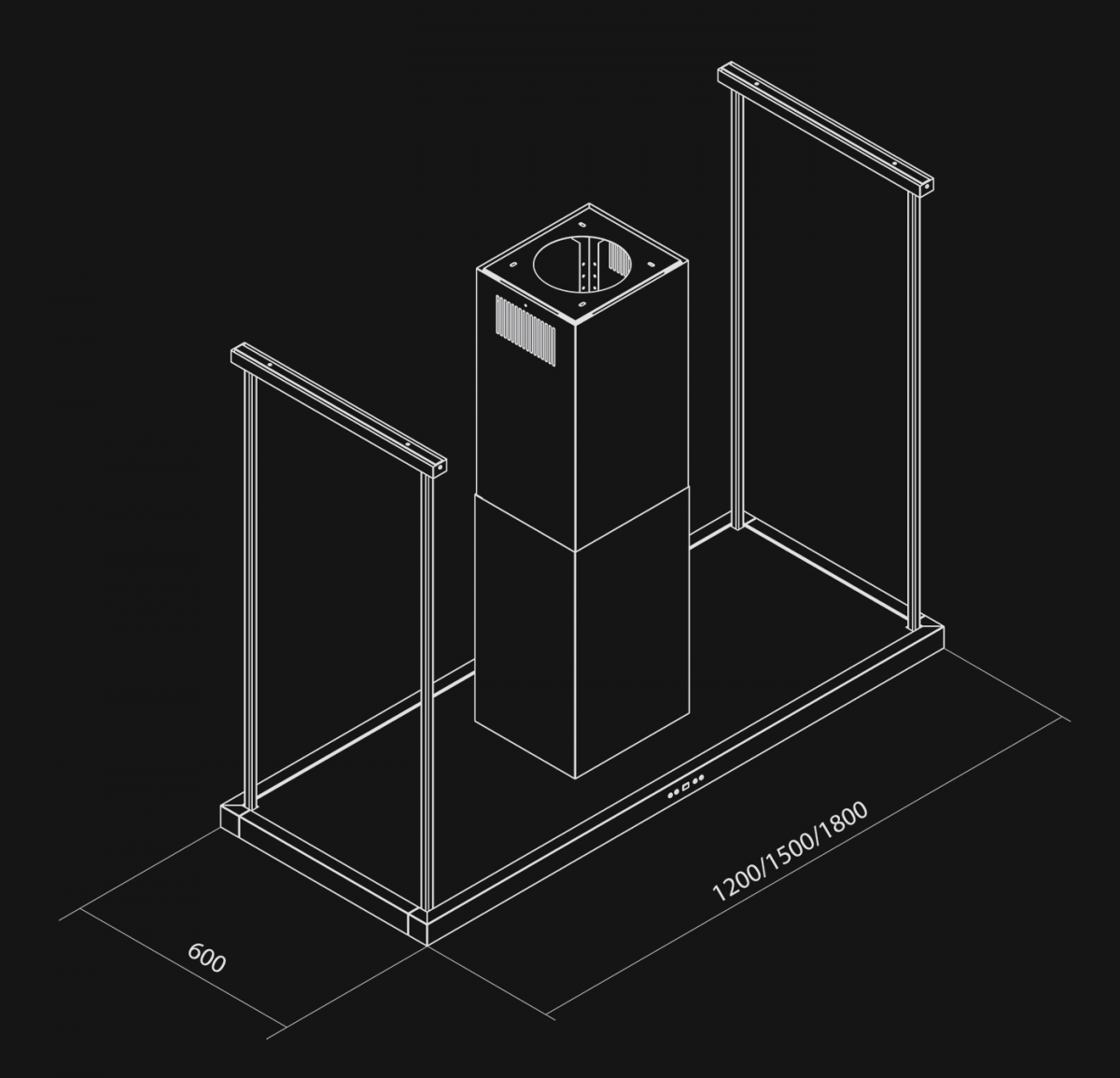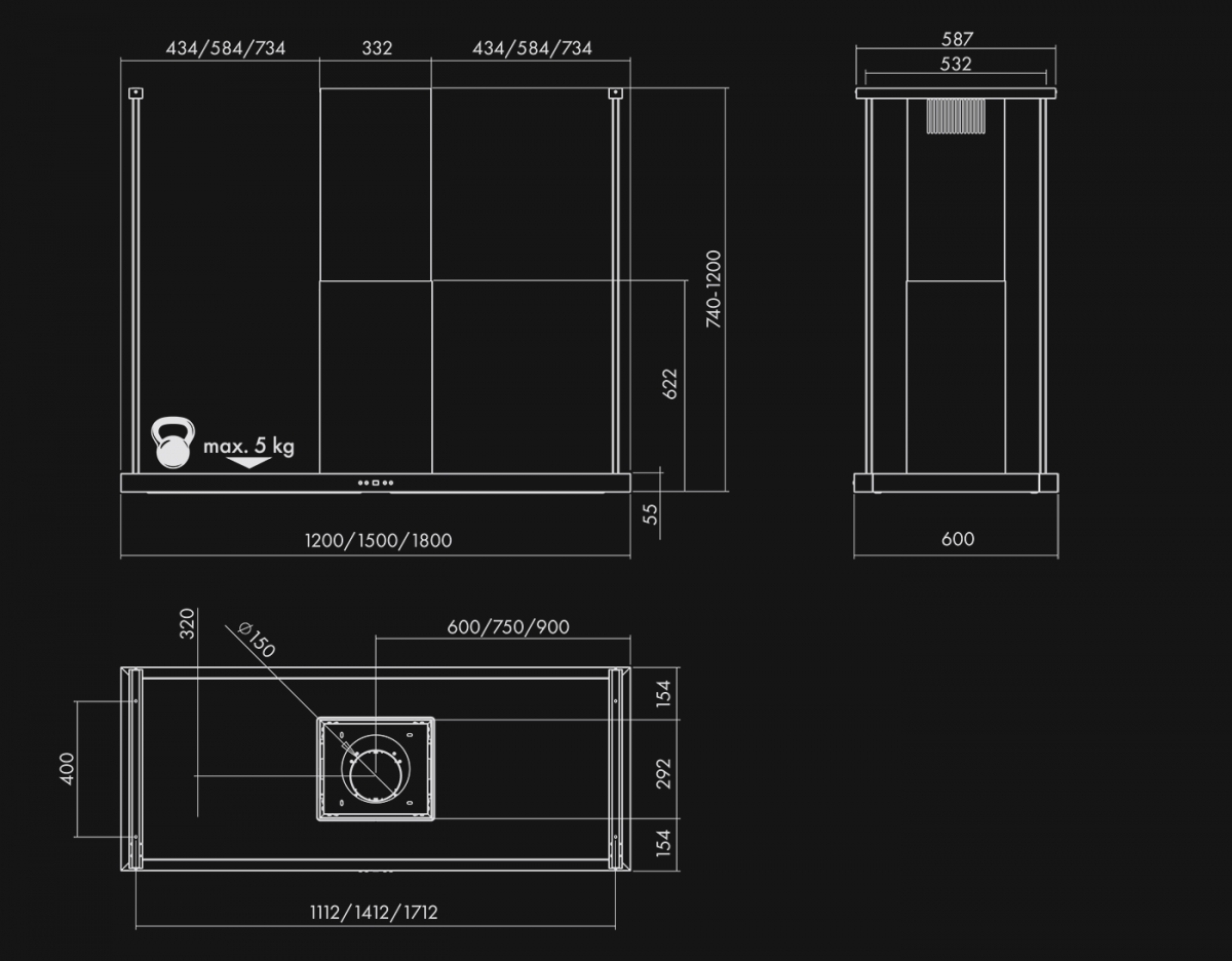 - Potrivire excelentă cu suprafața insulei de bucătărie – hotă disponibilă în dimensiuni: 120 cm, 150 cm, 180 cm