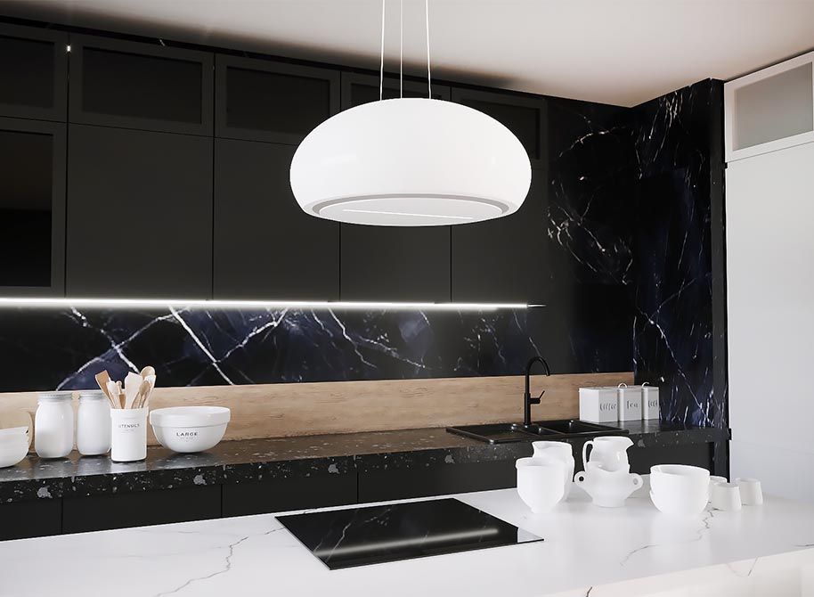 Construcție avansată tehnologic. Pe lângă ceramica de înaltă calitate, găsim oțel solid, sticlă securizată și igienică, LED-uri eficiente energetic, o turbină puternică și control cu telecomandă wireless. Filtrele cu carbon activ sunt GRATUITE, deja instalate de producător. Hota se montează pe tavan cu ajutorul unor cabluri de oțel rezistente, care adaugă o notă de lejeritate aparatului.
