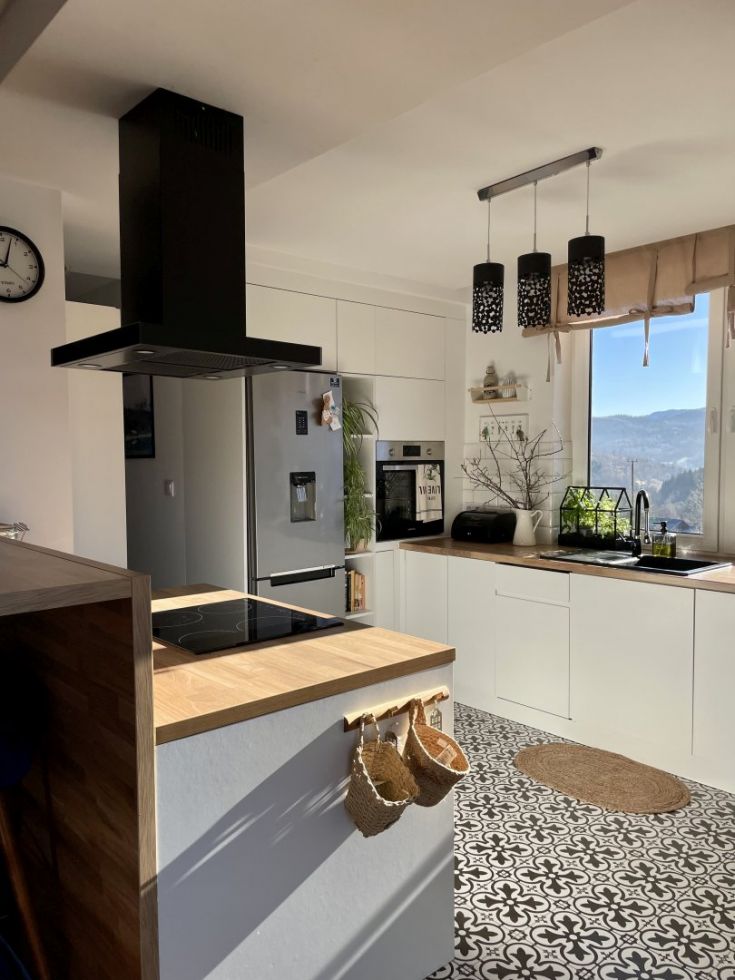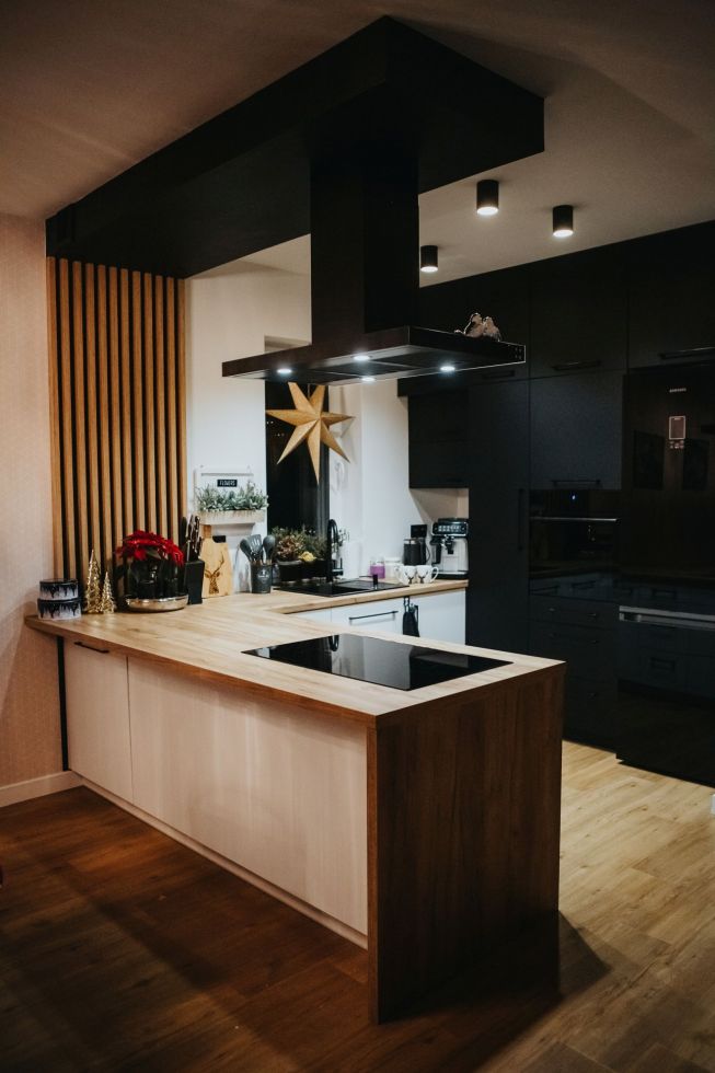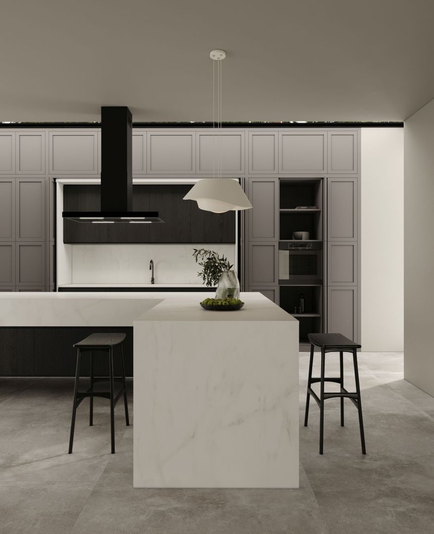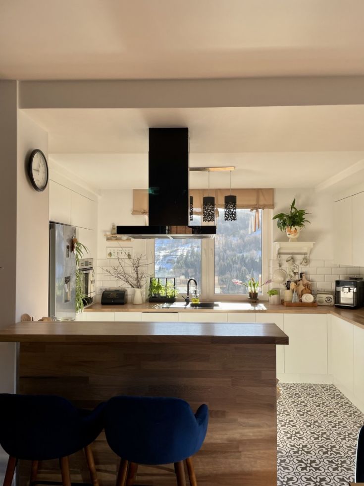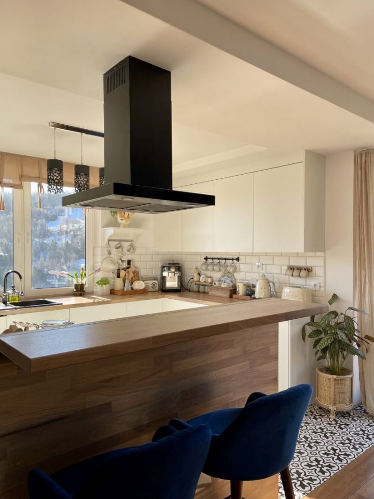Hotă de tip T inversat (așa-numitul T-shape) este incredibil de caracteristică. Forma legendară cu coș la mijloc și „poliță” pentru mărunțișuri face trimitere clară la gastronomie. O astfel de formă este practică și elegantă în același timp. Se va potrivi cu ușurință în interioare foarte clasice, minimaliste și scandinave, dar și moderne, industriale și loft.