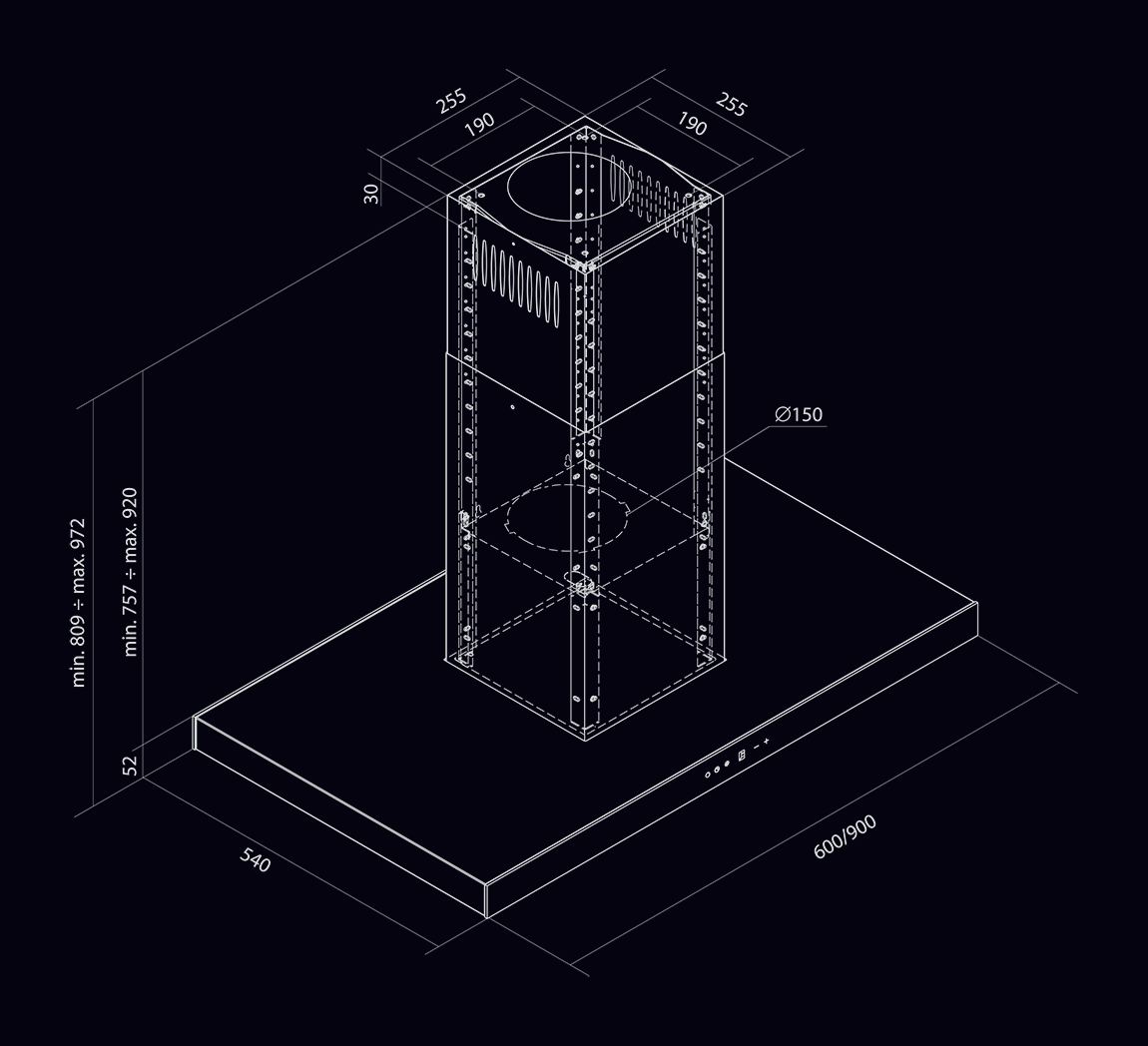 Un element important – dacă nu cel mai important – al oricărei hote este turbina sa. Iar cea din Sento Island Strips impresionează cu o capacitate de până la 850 m^3/h. Și acesta este doar începutul, deoarece hota noastră tip T-line poate absorbi vaporii de gătit în diferite moduri: