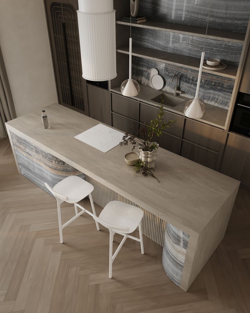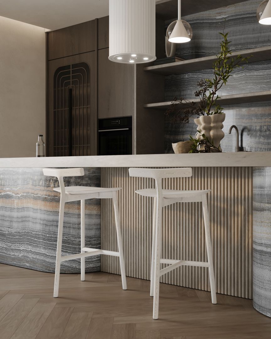 Construcția decorativă, ce amintește de finisajele „canelate” (fluted) la modă, este un adevărat deliciu pentru iubitorii de detalii. Tuburile nu doar decorează, ci și subliniază caracterul sofisticat al bucătăriei, conferindu-i un stil unic și eleganță. Voliera este o completare genială și un nou accent decorativ pentru suprafețele riflate. Adaugă tridimensionalitate și permite un joc de lumină unic, dar asta nu e tot. Voliera permite o personalizare mult mai largă a spațiului de gătit, fiind disponibilă în multe variante surprinzătoare, nu doar de culoare, ci și decorative.