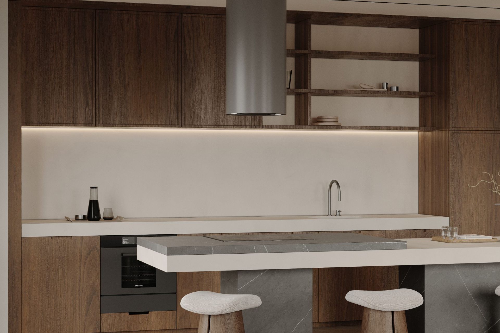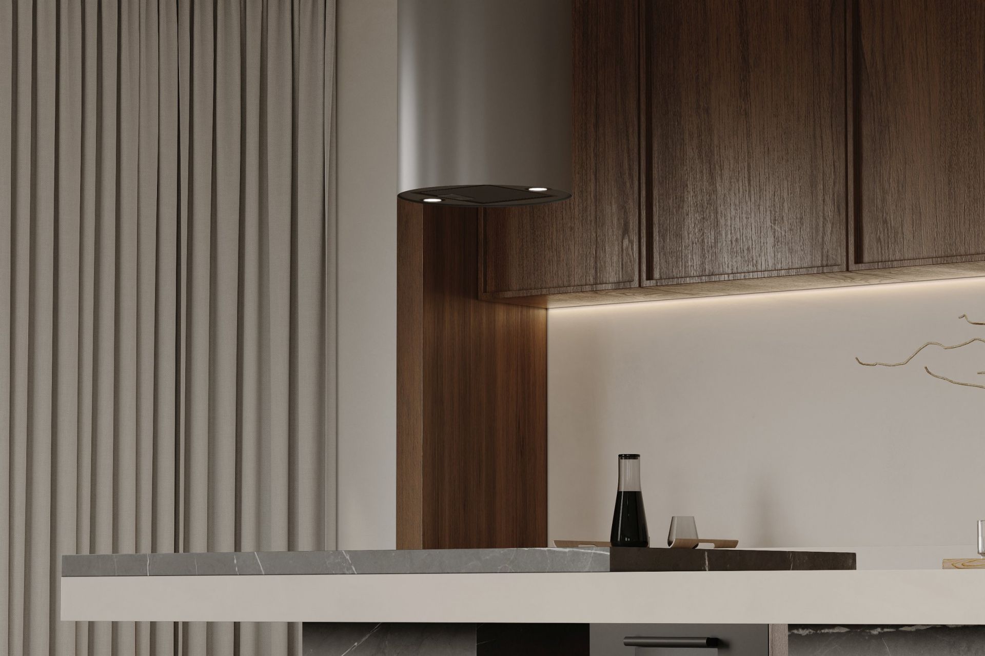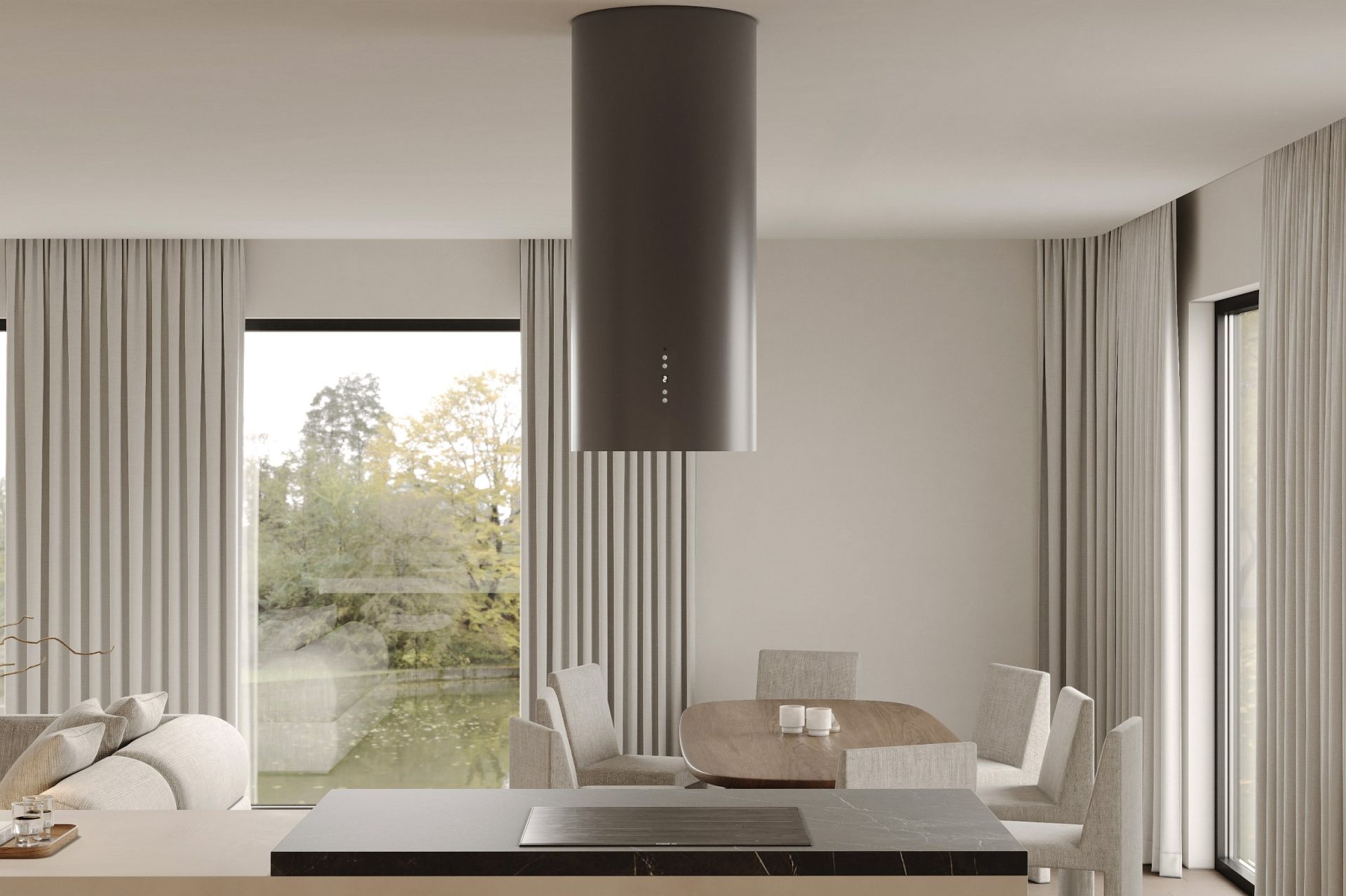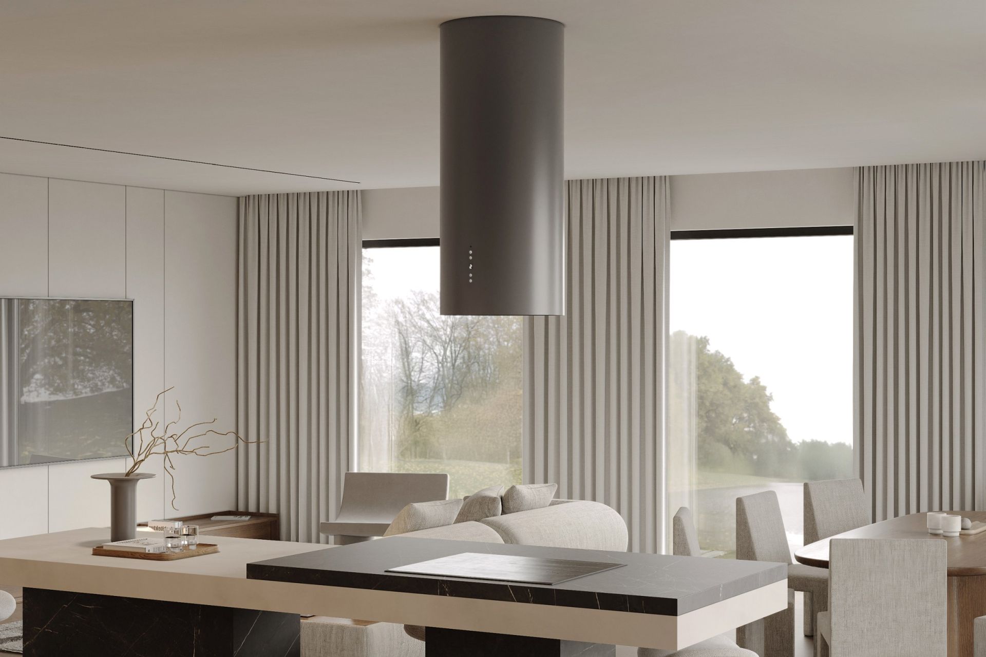 Cylindro Antracyt se distinge prin forma sa rotundă, construcția solidă din oțel, iluminatul LED eficient energetic și turbina de 850 m³/h. Pentru a menține estetica generală în tonuri de gri, hota este completată de un filtru de aluminiu negru.